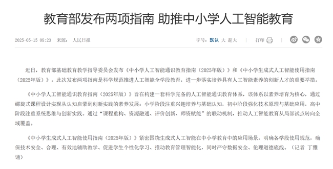 在体育硬指标落地、教育减负提质成为核心诉求的背景下,人工智能成为破解“健康与升学平衡”难题的最优解。2026年,教育部正式印发《中小学人工智能通识教育指南》,明确人工智能通识教育覆盖全学段,“十五五”规划纲要进一步强调深化教育数字化战略,推动人工智能与教育教学深度融合,着力培养具备AI素养的创新型人才。