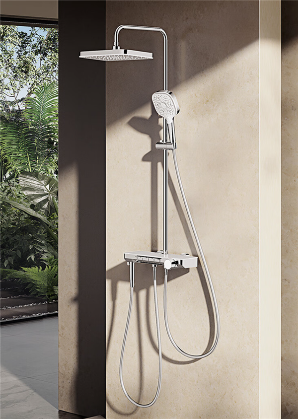 此外,该花洒还配备了371mm防烫置物台、钢化玻璃面板、分控式键盘按键、305mm天幕太阳花洒、130mm增压手持花洒,支持增压手持花洒出水、太阳花洒出水、双功能喷枪出水、隐藏式防溅下出水4种出水模式。