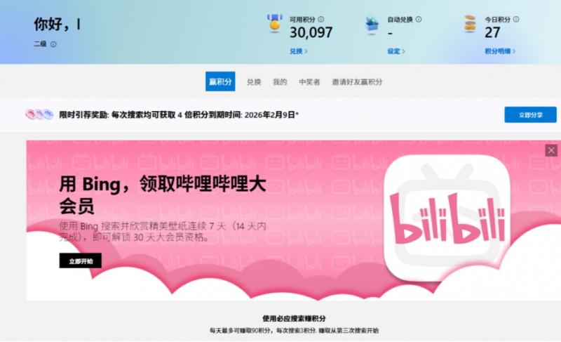 只要连续使用Bing搜索7天,即可兑换1个月B站大会员。