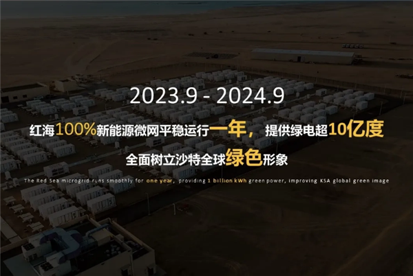 自2023年9月以来,红海100%新能源微网系统已稳定运行满一年,累计贡献绿色电力超过10亿度,不仅大幅降低了能源成本,更以每度电成本低于10美分的优异成绩,仅为传统柴油发电成本的约三分之一,为沙特客户提供了极具竞争力的LCOE(平准化度电成本)解决方案。